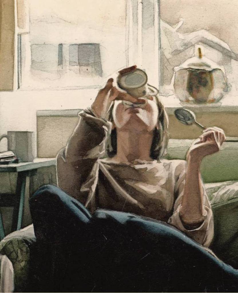 I’m drawn to his 2019 painting, “Having Coffee”, because of the simplicity of the subject matter. He has taken something so many of us experience regularly and without fanfare — a morning cup of coffee — and shown it in a new light. A woman is sitting curled up at the edge of her couch in comfortable day clothes, what most of us have been living in during the past two years. She holds a teaspoon in one hand, as she raises the mug in her other hand to her lips, tilting her head all the way back to capture the last drops.